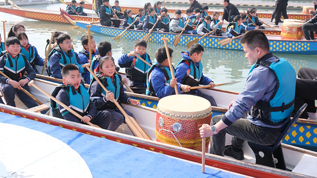 同時(shí),甌海鼓勵(lì)學(xué)校將常規(guī)課、拓展課、社團(tuán)課、課后服務(wù)、課外實(shí)踐活動(dòng)等進(jìn)行一體化設(shè)計(jì)實(shí)施。在溫州高鐵新城實(shí)驗(yàn)學(xué)校的“龍舟競(jìng)渡”自制小船比賽現(xiàn)場(chǎng),校長(zhǎng)黃建剛正坐在五年級(jí)學(xué)生陳軼晟和同學(xué)們用廢舊材料制作的“龍舟”里,奮力向前劃行。“劃得再快一些,千萬(wàn)不要沉下去……”陳軼晟緊盯著操場(chǎng)上的水池默念著。這條融合科學(xué)與美術(shù)知識(shí)制作的龍舟,是該校開(kāi)展跨學(xué)科主題學(xué)習(xí)的成果之一!巴黄茖W(xué)科邊界,激發(fā)學(xué)生解決問(wèn)題的熱情與跨界思維,培養(yǎng)學(xué)生的創(chuàng)新精神。”小學(xué)部副校長(zhǎng)王蓉表示,接下來(lái),學(xué)校還將持續(xù)開(kāi)發(fā)更多融合學(xué)科與生活的主題學(xué)習(xí)項(xiàng)目,促進(jìn)學(xué)生對(duì)知識(shí)的理解與內(nèi)化。