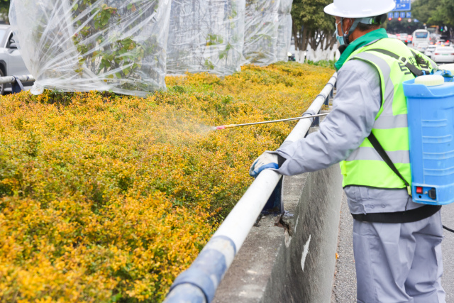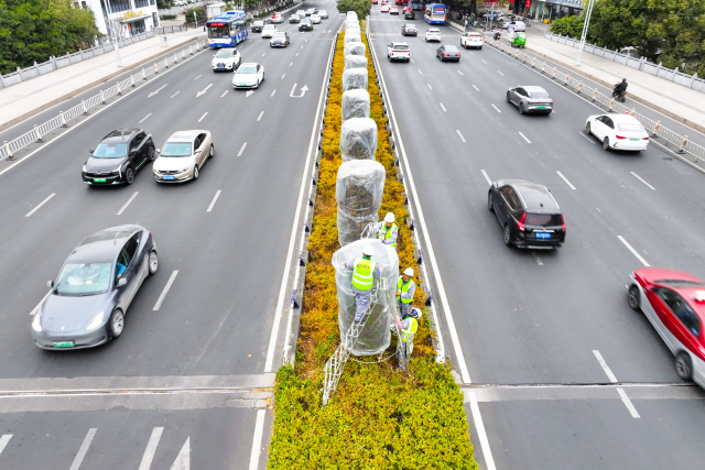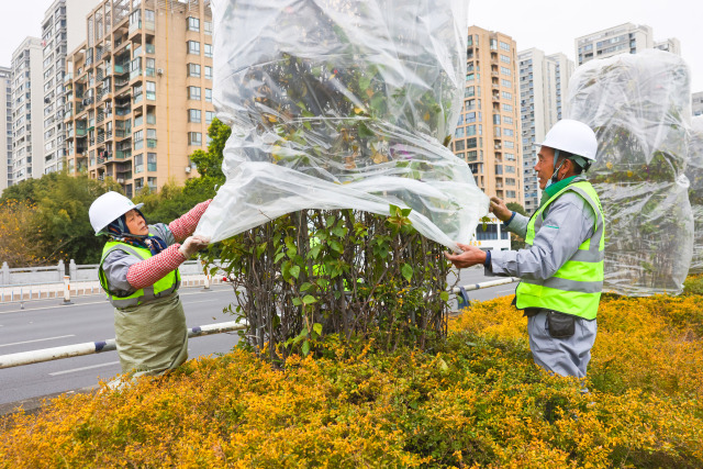 大寒時(shí)節(jié),氣溫驟降。1月20日,甌海區(qū)組織各綠化養(yǎng)護(hù)單位,為全區(qū)耐寒性不強(qiáng)的灌木覆蓋薄膜、噴灑防凍液等。植被穿上了“保暖衣”確保安全過冬。